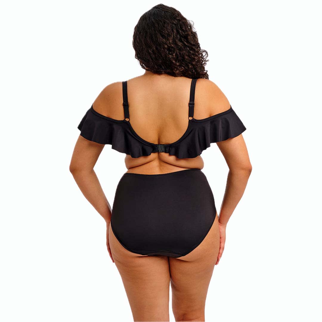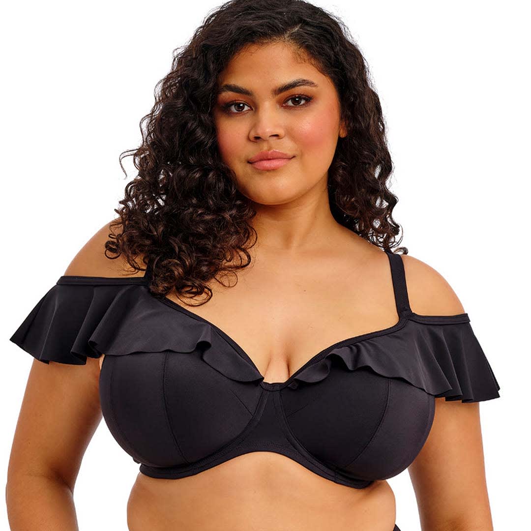 The Plain Sailing Underwire Plunge Bikini Top with narrow straps and a playful ruffle that can be worn on or off the shoulders, fully lined with light yet supportive fabric to give the look of a bikini with the fit of an Elomi lingerie bra, and cut from lightweight LYCRA® XTRA LIFE™ for lasting shape and comfort.
