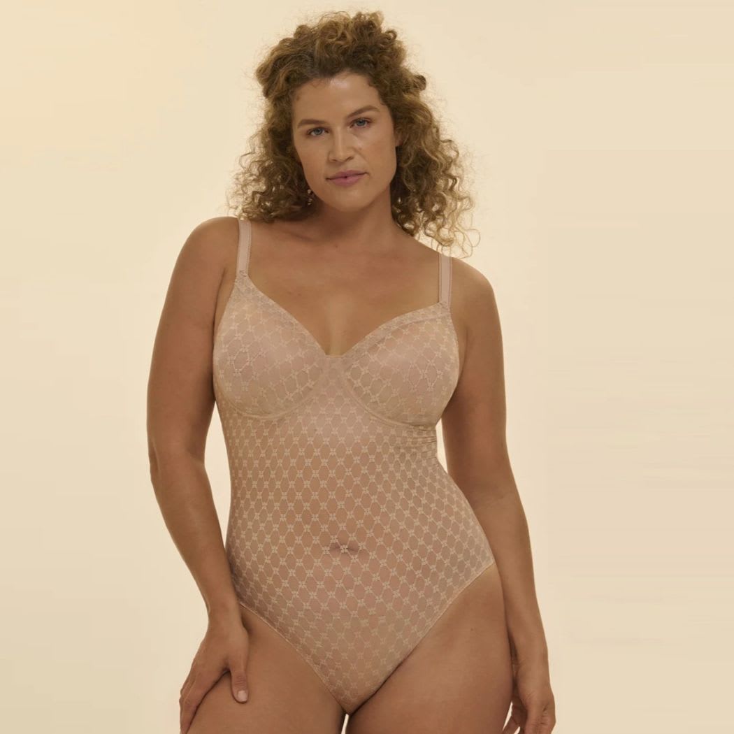 Underwired bodysuit with stretch and light support. Moulded lace cups for seamless, natural shaping. Controls and smooths the waist Lace back with discreet finishes. Multiway adjustable, decorated straps. Snap-button closure with 100% cotton gusset.