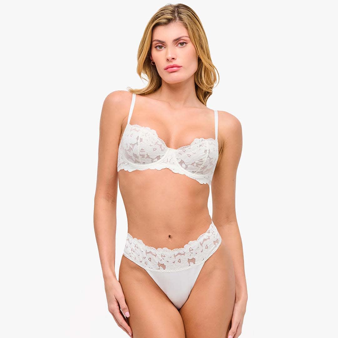 A balconette-style underwire bra crafted from soft, stretch cotton lace. This Romanza Balconette Bra is unpadded design features delicate scalloped trim for a feminine touch, along with adjustable straps and a hook-and-eye back closure. Hand wash only and avoid tumble drying to maintain its shape and softness.