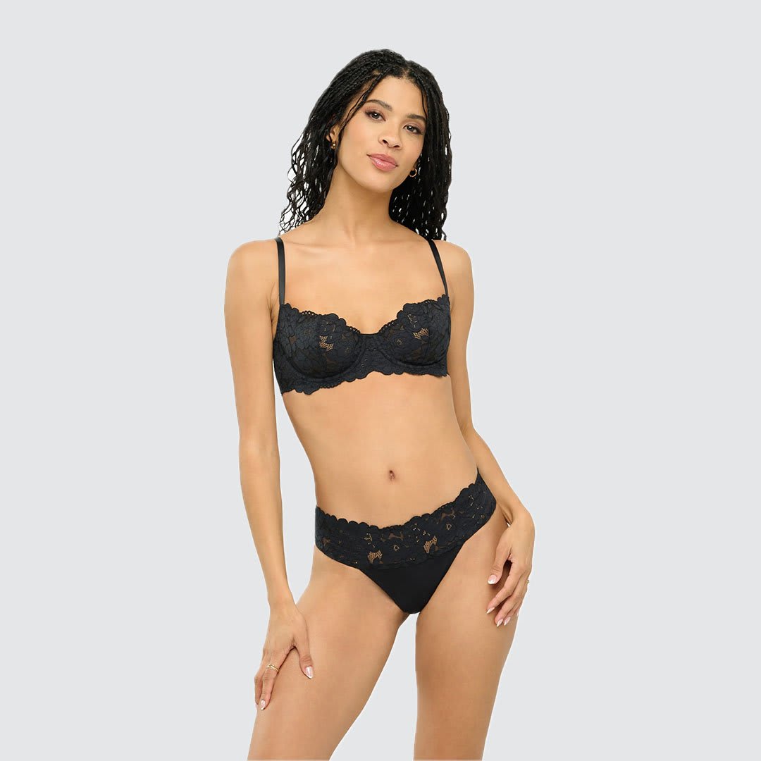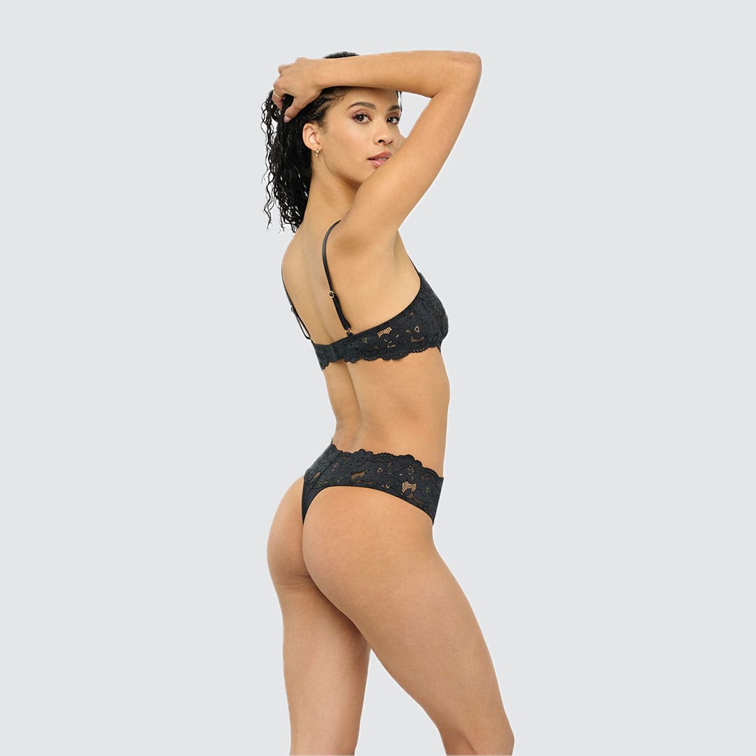 The Romanza Thong is a classic style with wide sides for a comfortable, flattering fit. Crafted from a Turkish cotton-blend stretch lace with delicate cording, it offers a vintage-inspired look, a soft handfeel, and breathable comfort for everyday wear. Finished with minimal rear coverage and a cotton-lined gusset. Hand wash in cold water and hang to dry.