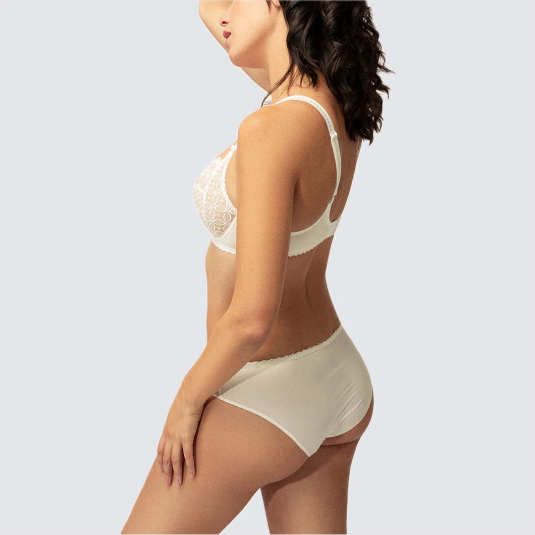Upgrade your lingerie collection with the flirty and luxurious Romy full cup bra from Empreinte. This design offers underwiring and non-padded cups for support and a comfortable fit. Adjustable straps and a classic hook and eye fastening ensure a personalized fit that showcases your silhouette. The semi-sheer cups feature delicate geometric lace with scalloped edges, while a luxurious centre embellishment and bow details on the straps add a finishing touch. Complete the look with coordinating pieces from Empreinte's Romy range.