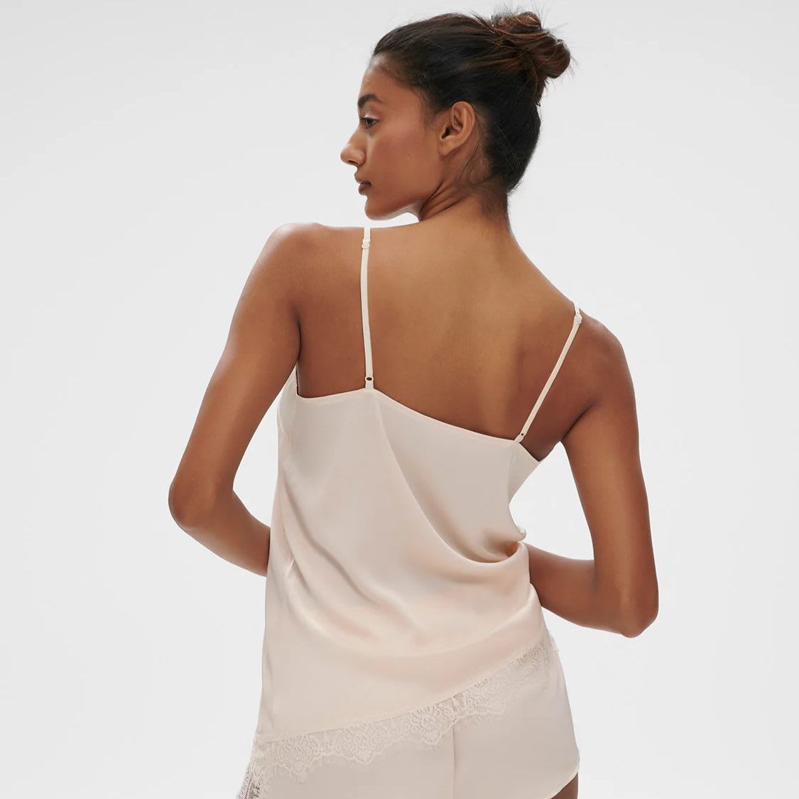 Top in satin and lace. Can be worn as outerwear. V-neckline enhanced with scalloped lace. Lace finishes on the bottom of the top.
