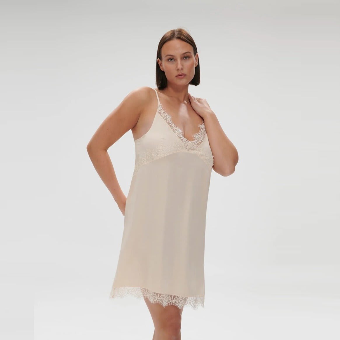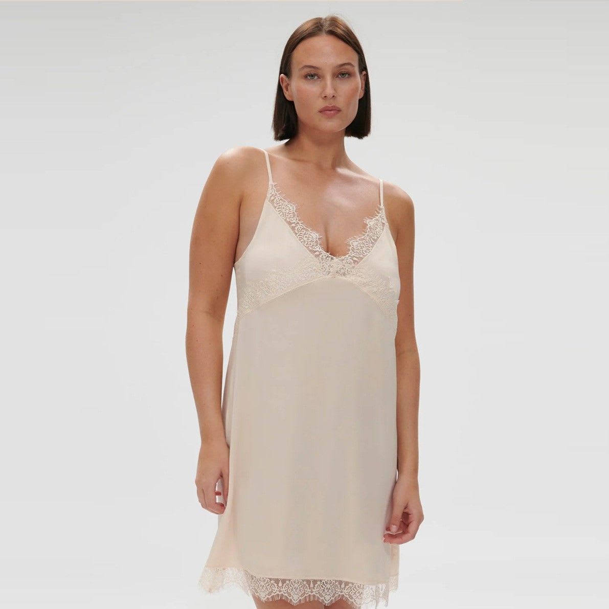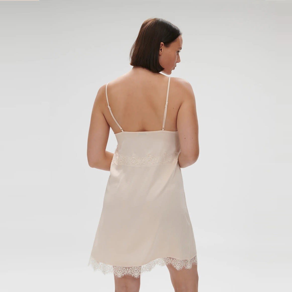 Short nightdress in satin and lace. V-neckline enhanced with scalloped lace. Adjustable thin straps in satin.