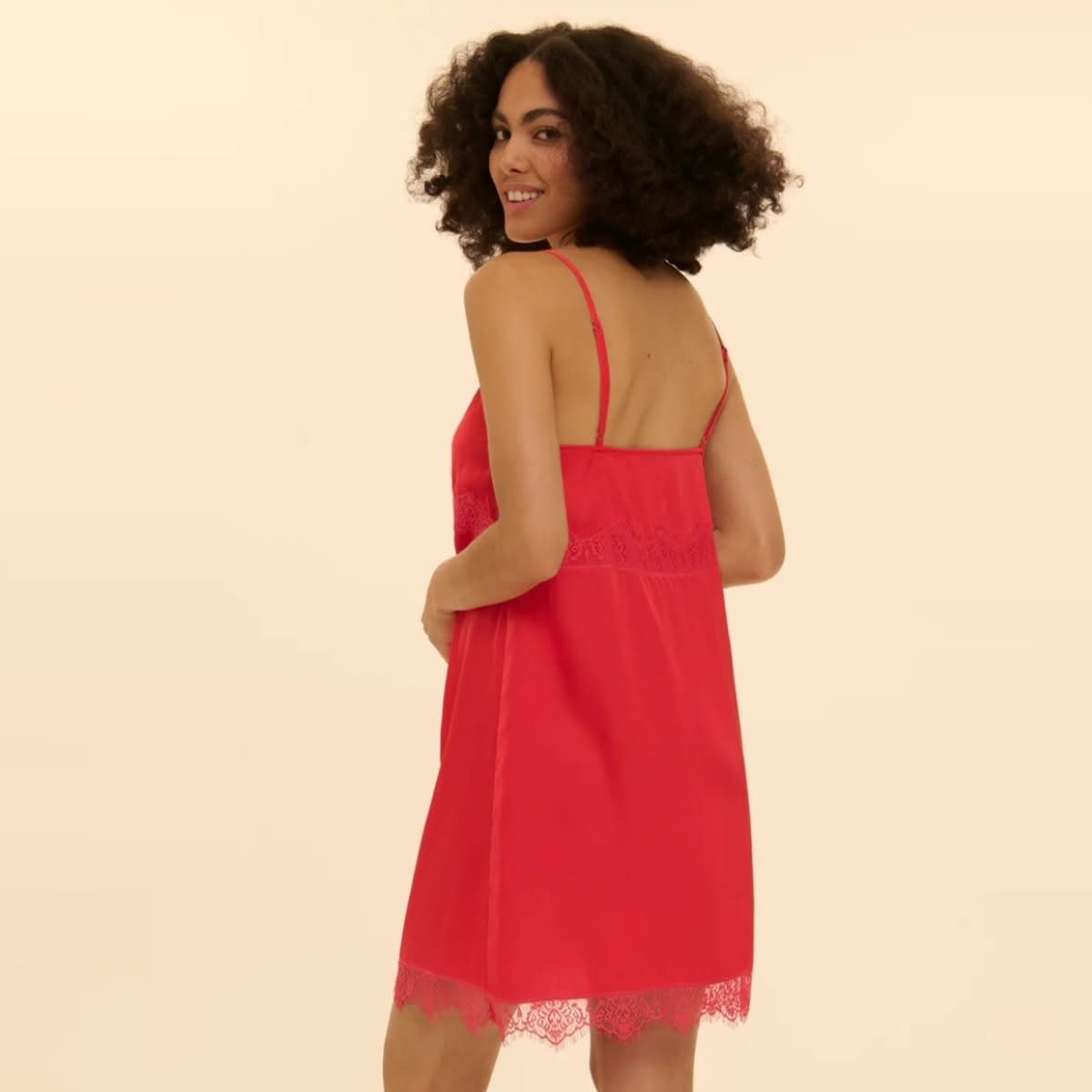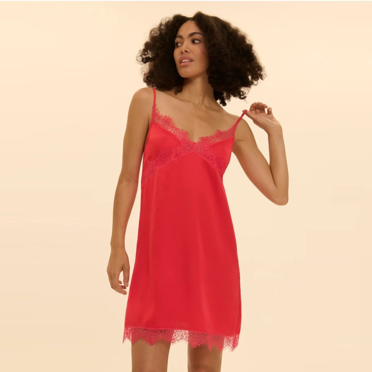 Short nightdress in satin and lace. V-neckline enhanced with scalloped lace. Adjustable thin straps in satin.