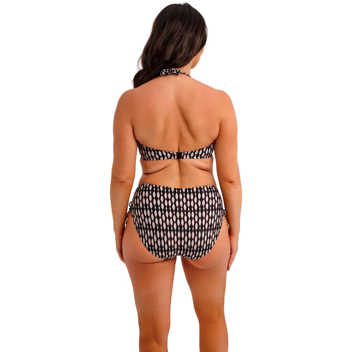 Featuring a striking graphic design in a black and muted blush pairing, this piece from the collection offers an elevated poolside look. Subtle design details, including hammered-effect gold rings at the apex that won’t heat up in the sun, add a touch of luxury. The plunge neckline and lined cups provide shape and support, while powernet-lined wings ensure added support and anchorage. A halter neck scarf tie completes the look, combining style with adjustable comfort for a perfect fit.