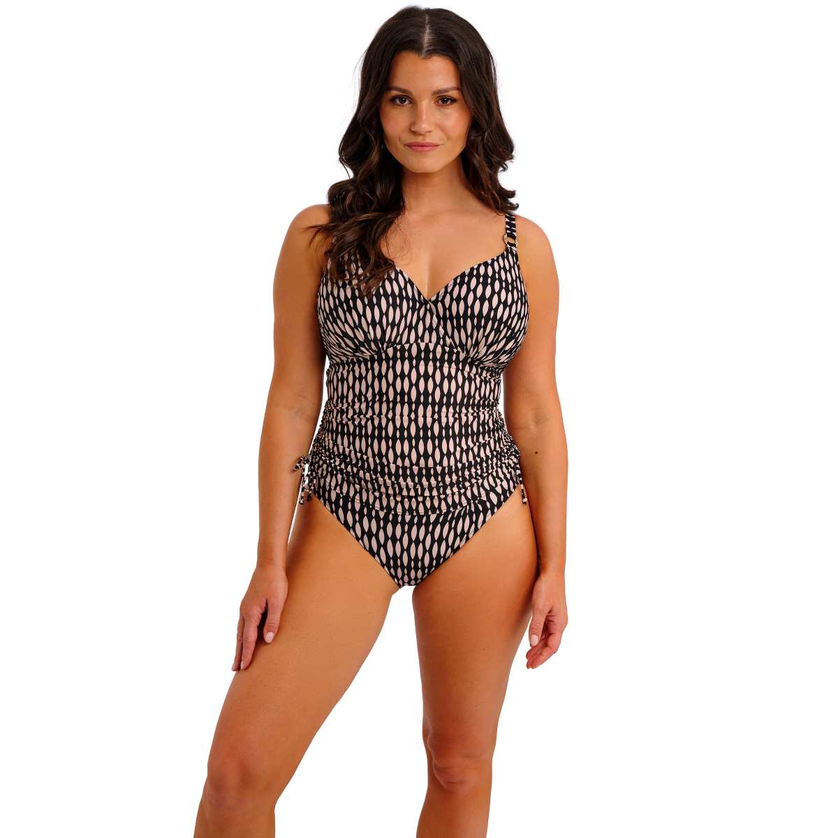 Feel supported and sun-ready with Shell Bay, featuring a graphic design in a sophisticated black and muted blush pairing for an elevated poolside look. Subtle details, such as hammered-effect gold rings at the apex that won’t heat up in the sun, add a touch of luxury. The flattering wrap-over front, adjustable tie sides, and ruching effect beautifully enhance and flatter the tummy area while offering a variation in body length. Concealed underwire, powernet-lined wings, and a hidden inner hook-and-eye provide excellent support and control, while fixed fully adjustable shoulder straps ensure a comfortable, custom fit. Shell Bay is swimwear that feels as good as it looks.