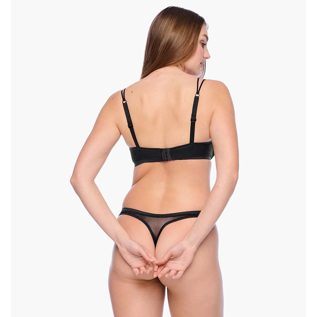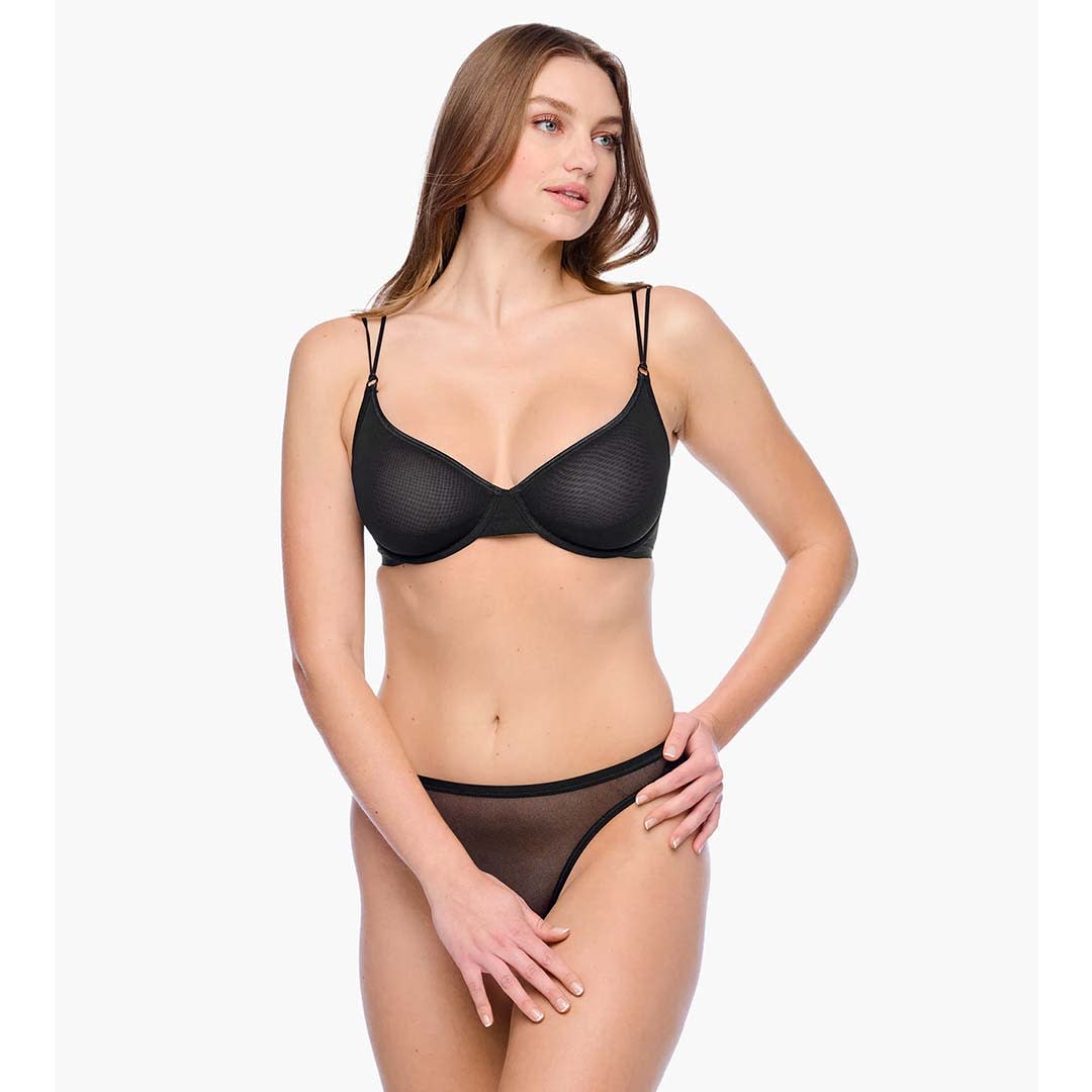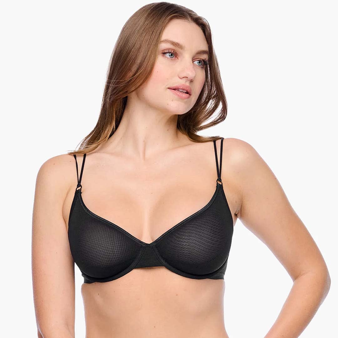 A lightweight, underwire Soire Confidence Molded Bra crafted from sheer stretch mesh, featuring smooth unlined cups, seamless flat-lock seams, shiny soft elastic trim, adjustable straps, and a hook-and-eye back closure for a sleek fit under clothing.