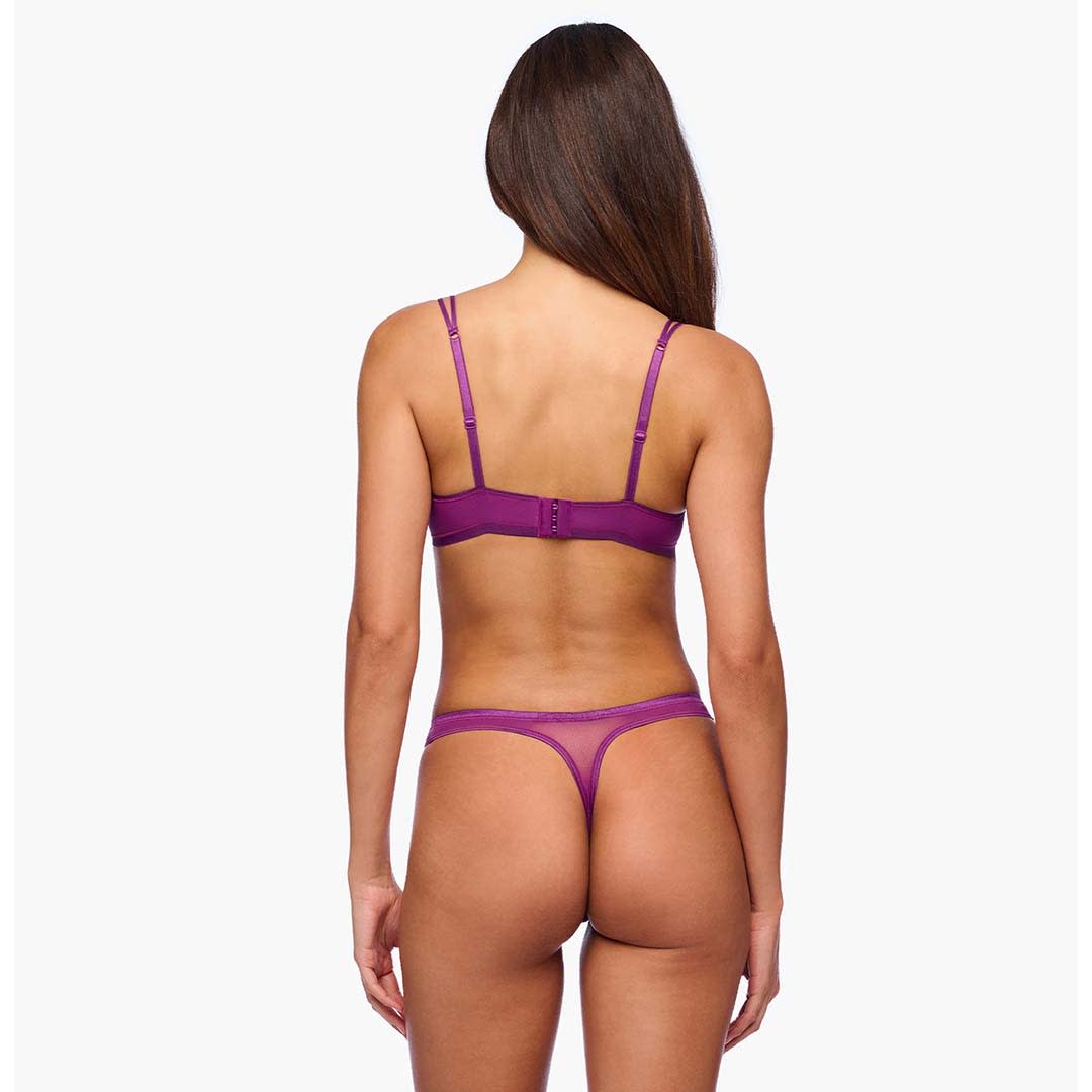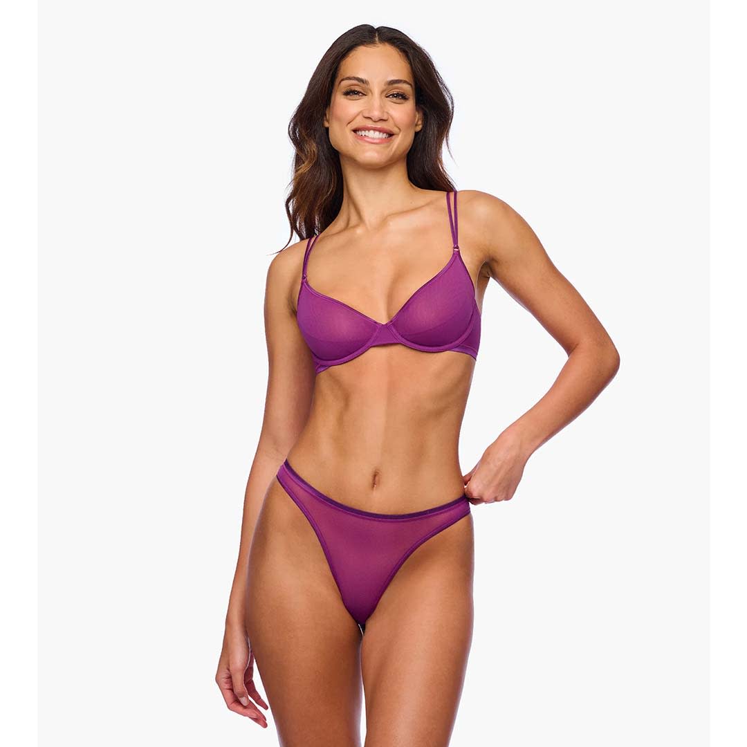 A lightweight, underwire Soire Confidence Molded Bra crafted from sheer stretch mesh, featuring smooth unlined cups, seamless flat-lock seams, shiny soft elastic trim, adjustable straps, and a hook-and-eye back closure for a sleek fit under clothing.