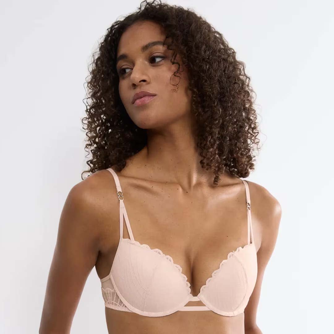 The That Night In Vegas Push Up Bra blends bold graphic lace, transparent mesh, and GRS-certified recycled materials into a low-coverage, wired, half-padded push-up bra with deep cleavage, light flexible comfort wire, signature ring detail, double straps, and a modern, seductive edge for adventurous, glamorous lingerie lovers.