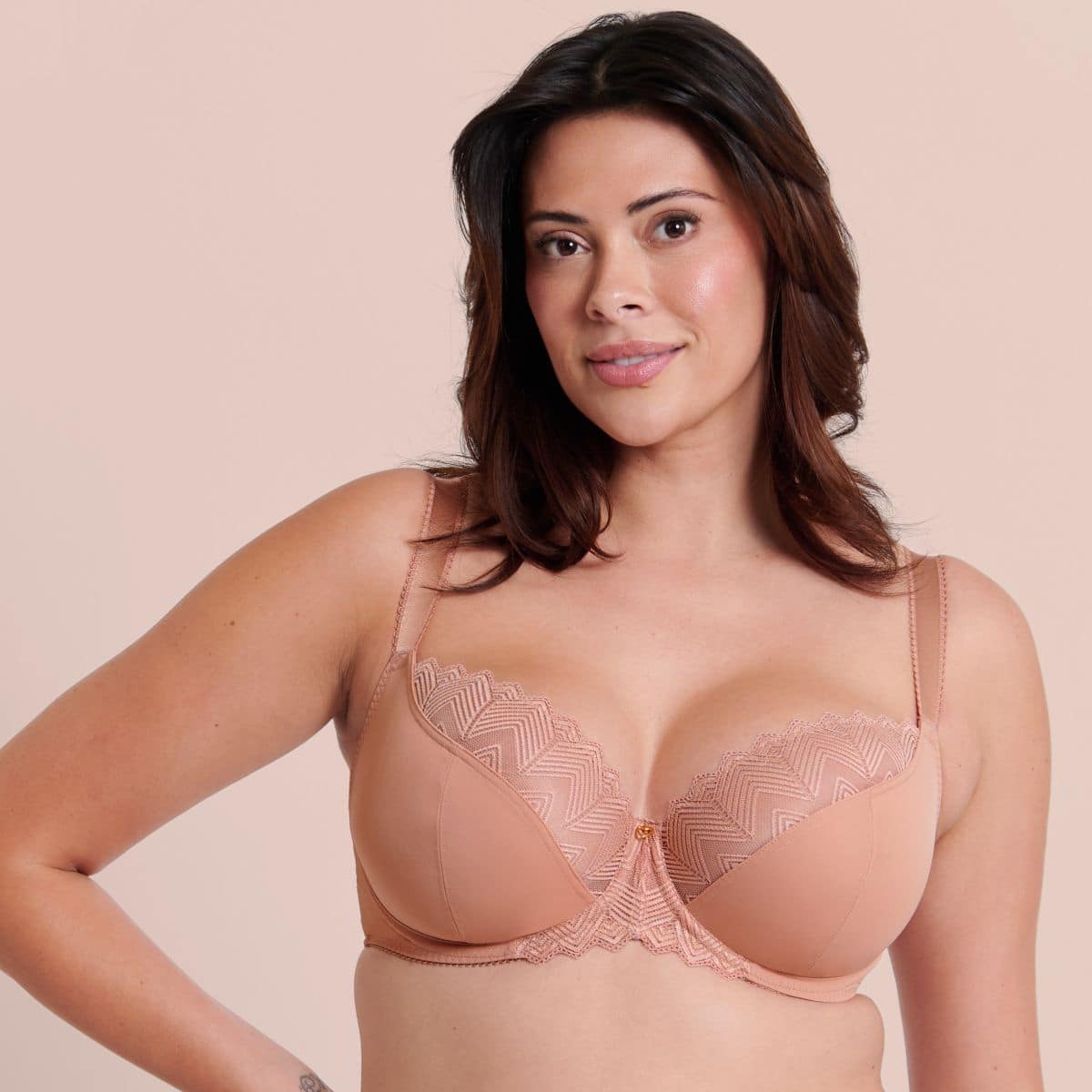 Underwired non padded balcony bra. Geometric lace adorns the collection to frame your curves. Upfront Technology and Stretch lace top cup.