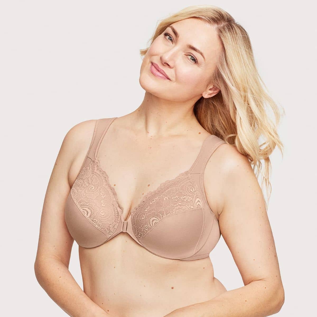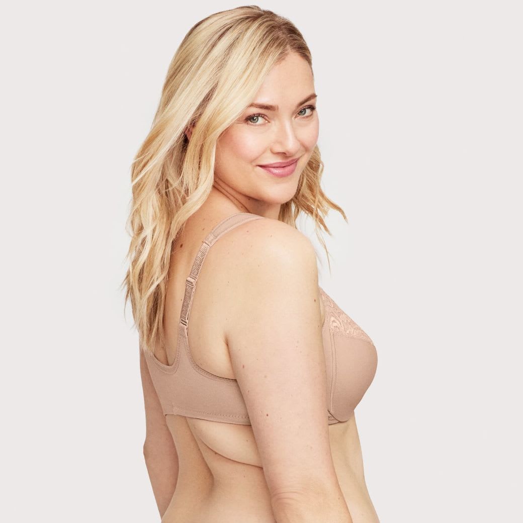 WonderWire® design features a padded underwire with an extra layer of cushion to prevent wire poke. Lace-topped cups feature side-bust control to shape and support. Easy on and off secure front closure. Wide, cushioned straps adjust to your fit.
