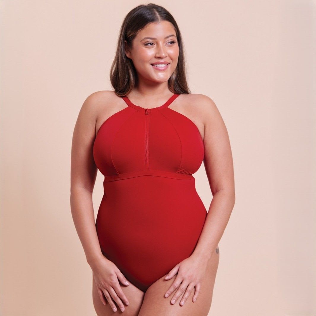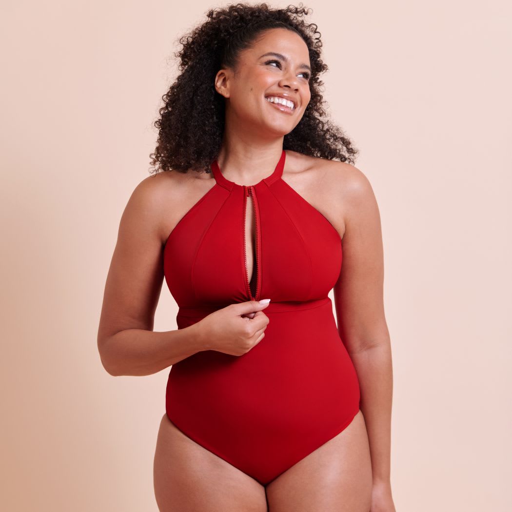 This fully-lined swimsuit uses quick-drying swim fabric, providing support and comfort. Featuring a secure zip feature for adjustable coverage.